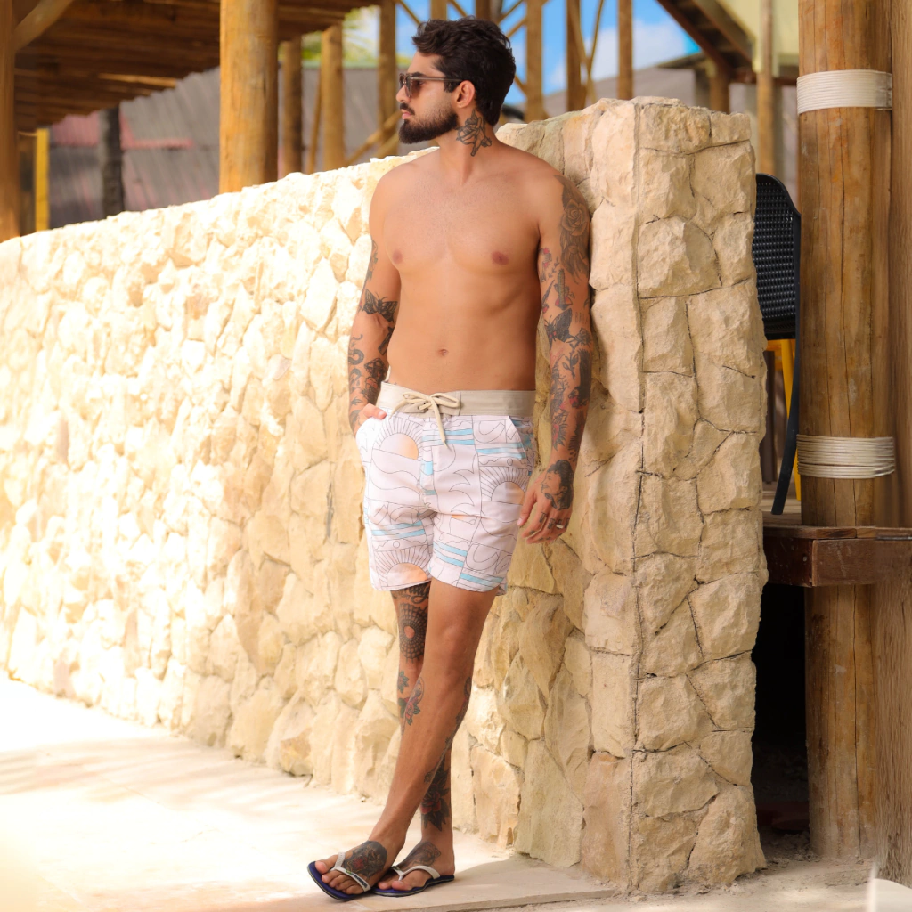 A Bermuda Retrô traz modelagem curta e estampa tropical marcante. O cós firme com cadarço garante ajuste seguro, enquanto os bolsos laterais deixam a peça prática para o dia a dia.